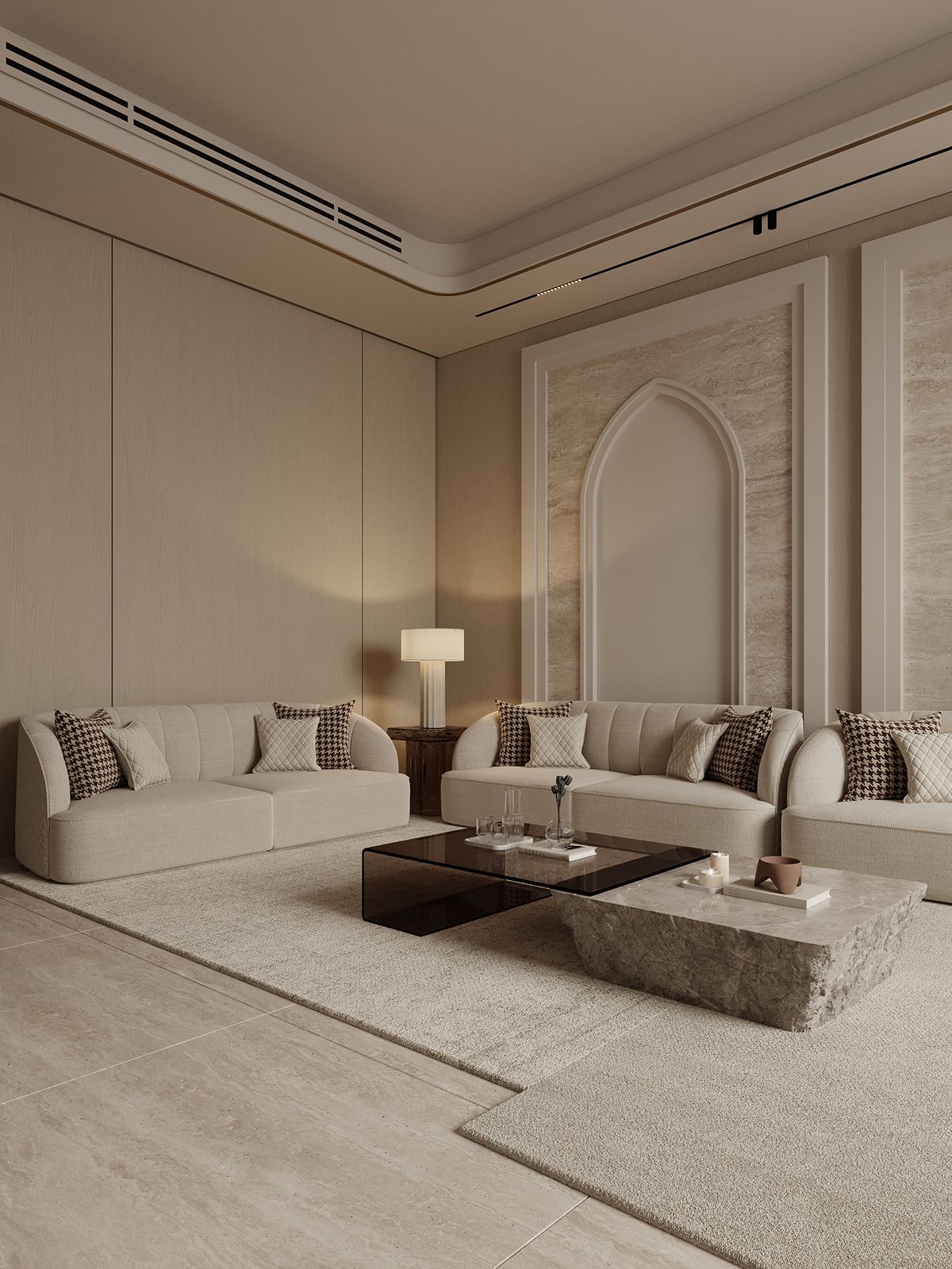 Designed for a private villa in Al Muwaiji, this project focused on "Hidden Luxury." We utilized Italian travertine and recessed lighting to create a space for quiet gathering.